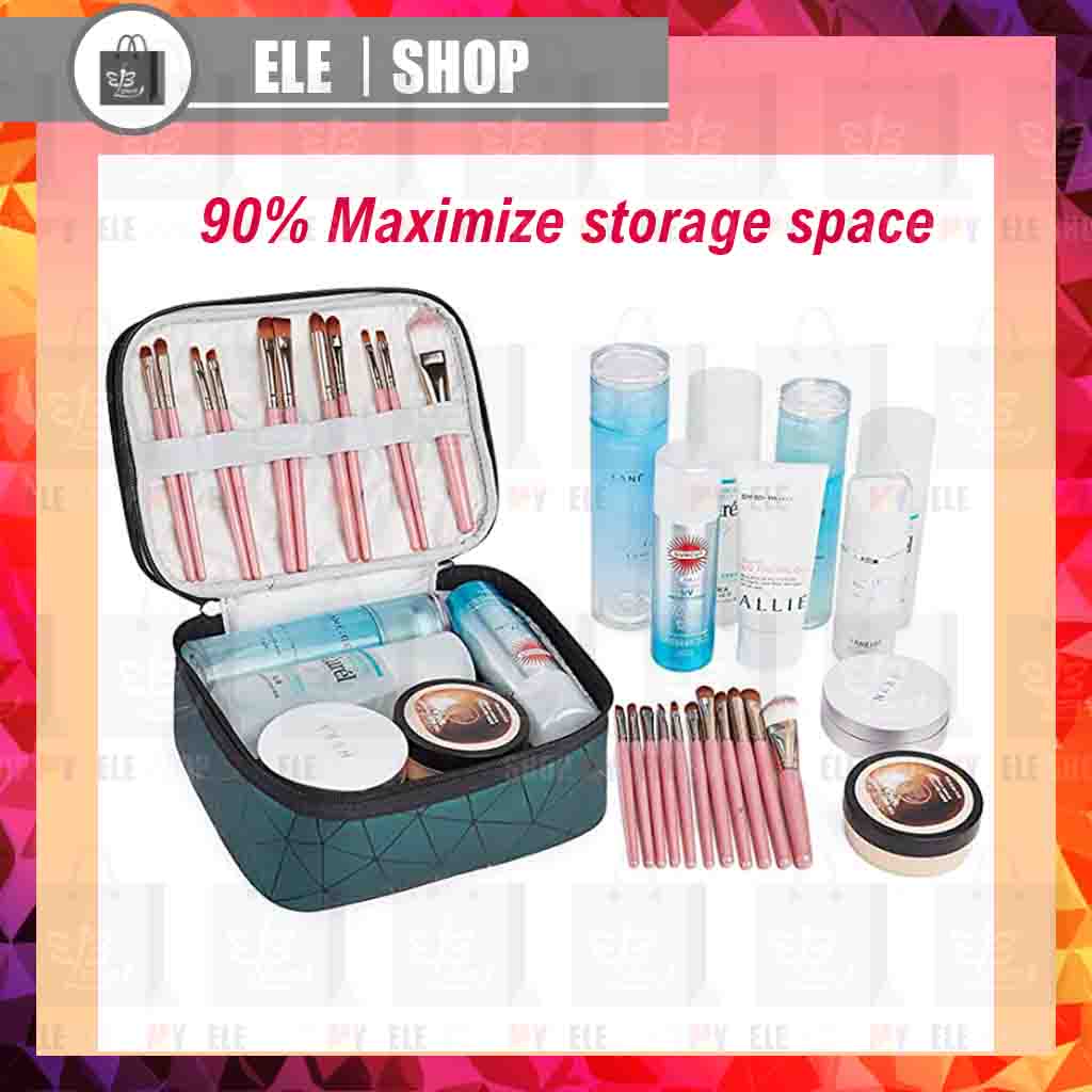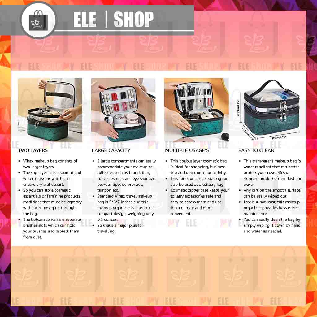 【 BEG KOSMETIK PELBAGAI FUNGSI】:- Tiga gaya berbeza beg pengatur solek menyediakan pilihan berbeza untuk keperluan anda yang berbeza. Beg solek terbesar mempunyai dua lapisan. Ia boleh menyimpan beberapa kosmetik besar, peralatan mandian, barang kemas. Beg solek kedua boleh memuatkan beberapa produk kecantikan dan kegunaan harian. Beg solek terkecil boleh menyusun produk solekan, kunci, titisan mata yang diperlukan. Boleh digunakan sebagai beg solek untuk dompet, beg tandas, beg peralatan mandian, beg perjalanan